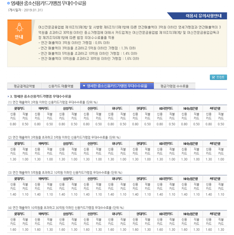 여신금융협회의 영세중소 가맹점 카드사 수수료율 (게시일자 : 2019.01.31)
